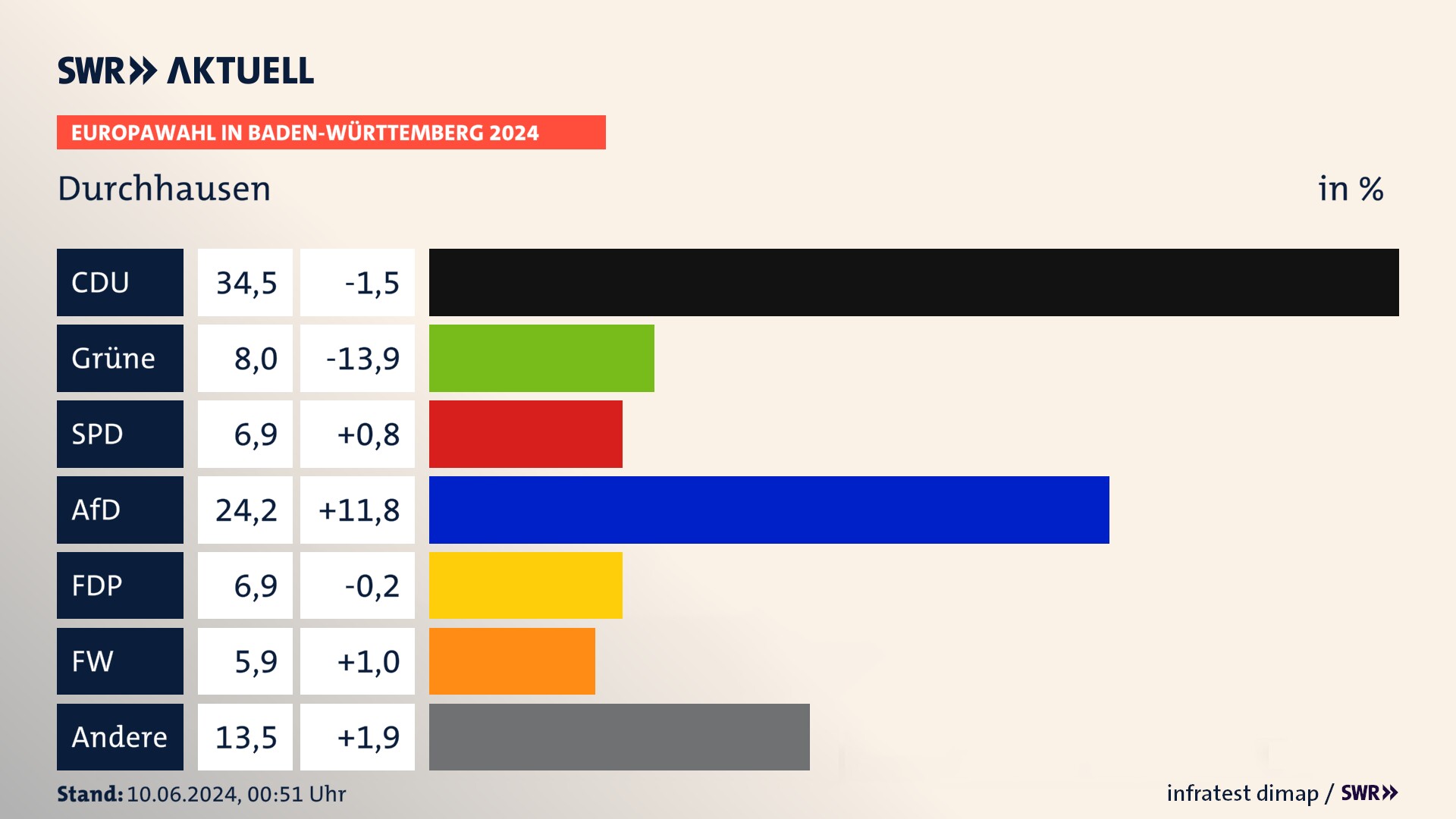 In Durchhausen verliert die CDU leicht (-1,5 Prozentpunkte) und erzielt 34,5 Prozent der gültigen Stimmen. Die Grünen erreichen 8,0 Prozent und verlieren stark (-13,9 Prozentpunkte). Die SPD erzielt 6,9 Prozent und gewinnt leicht (+0,8 Prozentpunkte). Die AfD gewinnt stark (+11,8 Prozentpunkte) und kommt auf 24,2 Prozent. Die FDP erreicht 6,9 Prozent und verliert leicht (-0,2 Prozentpunkte). Die Freien Wähler erzielen 5,9 Prozent und gewinnen leicht (+1,0 Prozentpunkte).