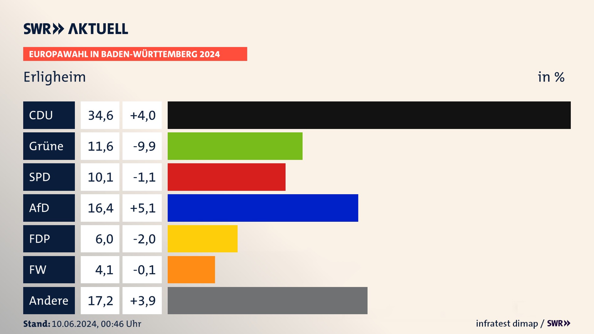 In Erligheim gewinnt die CDU deutlich (+4,0 Prozentpunkte) und erzielt 34,6 Prozent der gültigen Stimmen. Die Grünen erreichen 11,6 Prozent und verlieren stark (-9,9 Prozentpunkte). Die SPD erzielt 10,1 Prozent und verliert leicht (-1,1 Prozentpunkte). Die AfD gewinnt stark (+5,1 Prozentpunkte) und kommt auf 16,4 Prozent. Die FDP erreicht 6,0 Prozent und verliert leicht (-2,0 Prozentpunkte). Die Freien Wähler erzielen 4,1 Prozent und verlieren leicht (-0,1 Prozentpunkte).