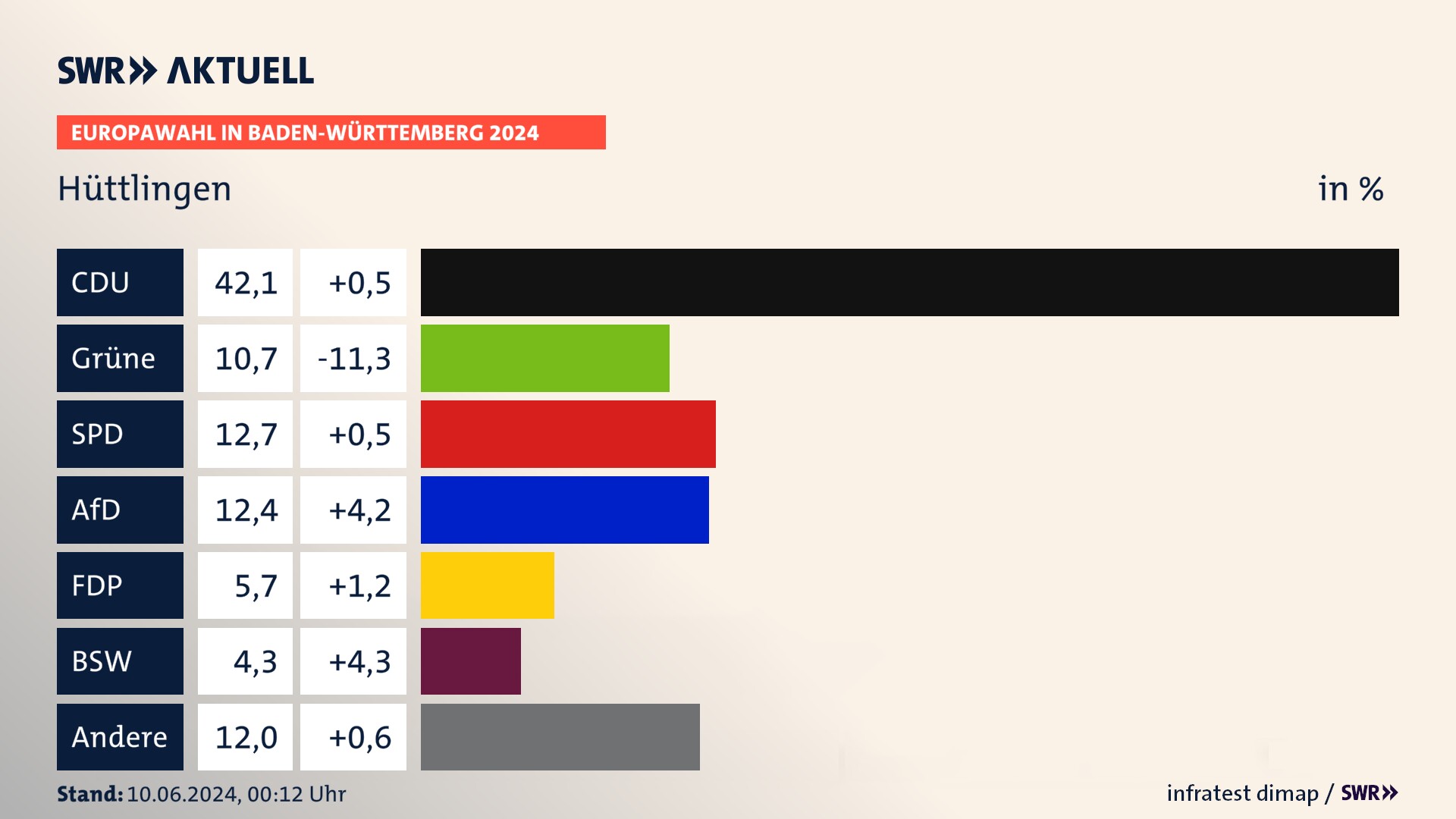 In Hüttlingen gewinnt die CDU leicht (+0,5 Prozentpunkte) und erzielt 42,1 Prozent der gültigen Stimmen. Die Grünen erreichen 10,7 Prozent und verlieren stark (-11,3 Prozentpunkte). Die SPD erzielt 12,7 Prozent und gewinnt leicht (+0,5 Prozentpunkte). Die AfD gewinnt deutlich (+4,2 Prozentpunkte) und kommt auf 12,4 Prozent. Die FDP erreicht 5,7 Prozent und gewinnt leicht (+1,2 Prozentpunkte). Die 2019 nicht angetretene Partei BSW bekommt 4,3 Prozent.