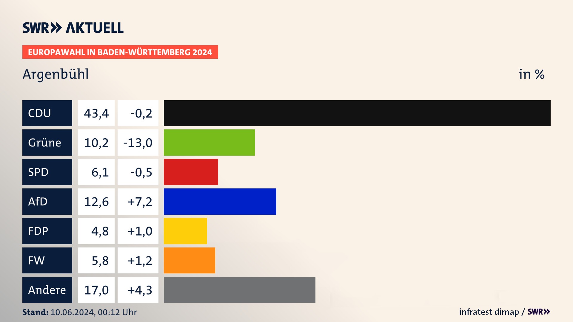In Argenbühl verliert die CDU leicht (-0,2 Prozentpunkte) und erzielt 43,4 Prozent der gültigen Stimmen. Die Grünen erreichen 10,2 Prozent und verlieren stark (-13,0 Prozentpunkte). Die SPD erzielt 6,1 Prozent und verliert leicht (-0,5 Prozentpunkte). Die AfD gewinnt stark (+7,2 Prozentpunkte) und kommt auf 12,6 Prozent. Die FDP erreicht 4,8 Prozent und gewinnt leicht (+1,0 Prozentpunkte). Die Freien Wähler erzielen 5,8 Prozent und gewinnen leicht (+1,2 Prozentpunkte).